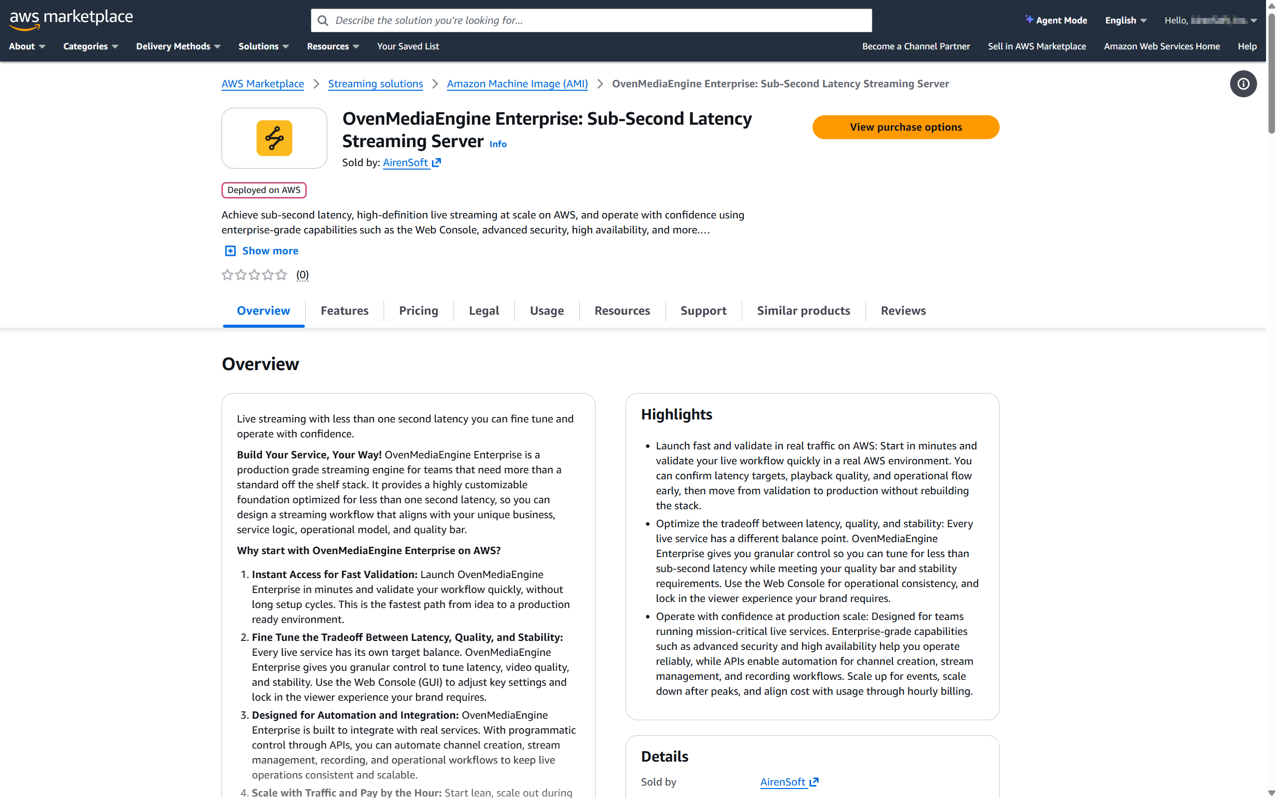 2. Search for <mark style="color:yellow;">**OvenMediaEngine Enterprise**</mark>, then open the product page and review the details.