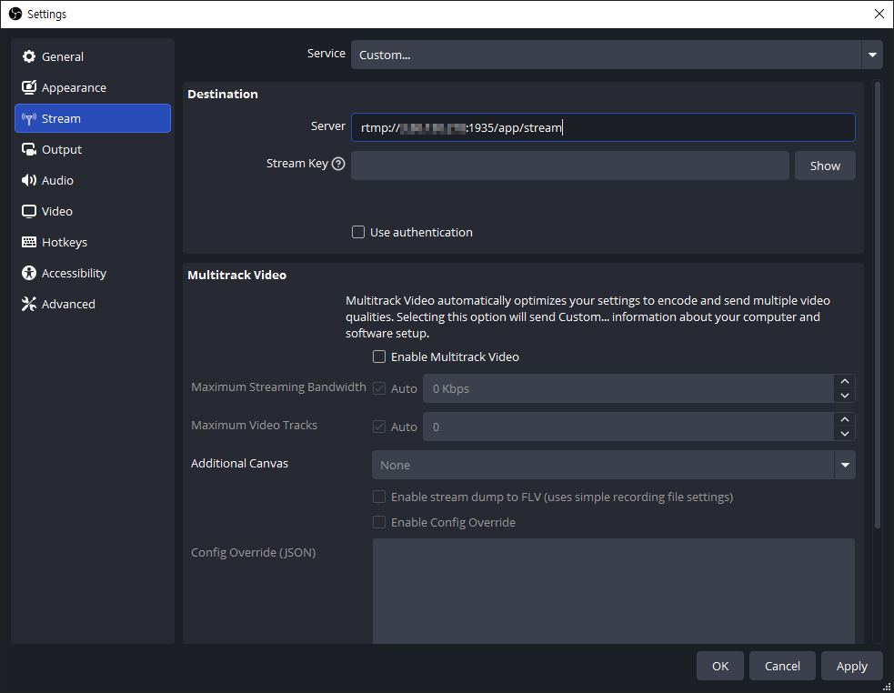 If the Ingress URL already includes the stream key, you may leave Stream Key empty.