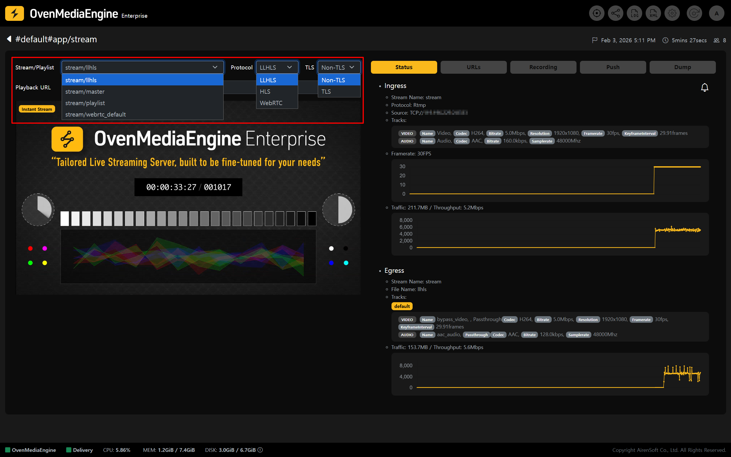 * Then, in the player provided by OvenMediaEngine Enterprise (OvenPlayer), select options such as <mark style="color:yellow;">`Playlist`</mark>, <mark style="color:yellow;">`Protocol`</mark>, and <mark style="color:yellow;">`TLS`</mark> to start playback.