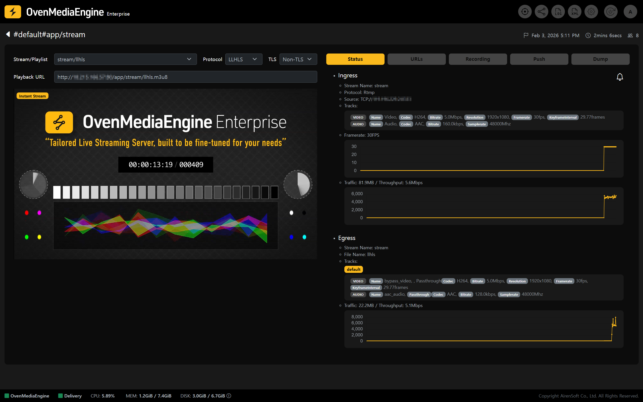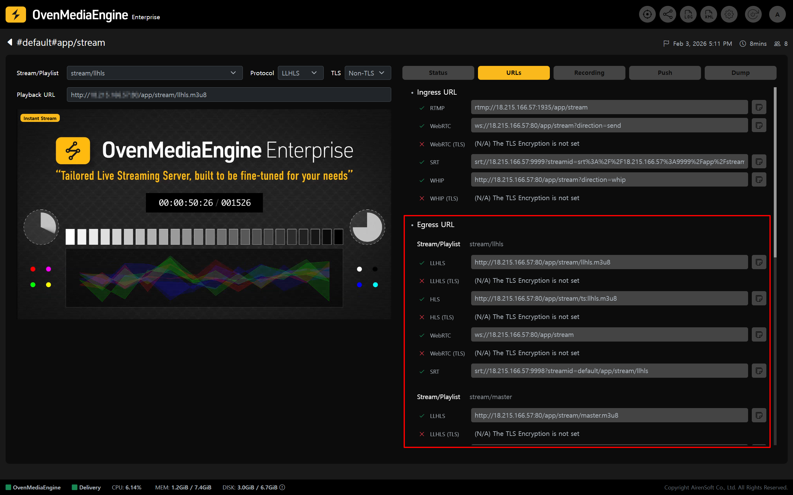 * LLHLS URL format: `http[s]://{Public IPv4 or Domain}:{Port}/{App name}/{Stream name}/{Playlist name}.m3u8`