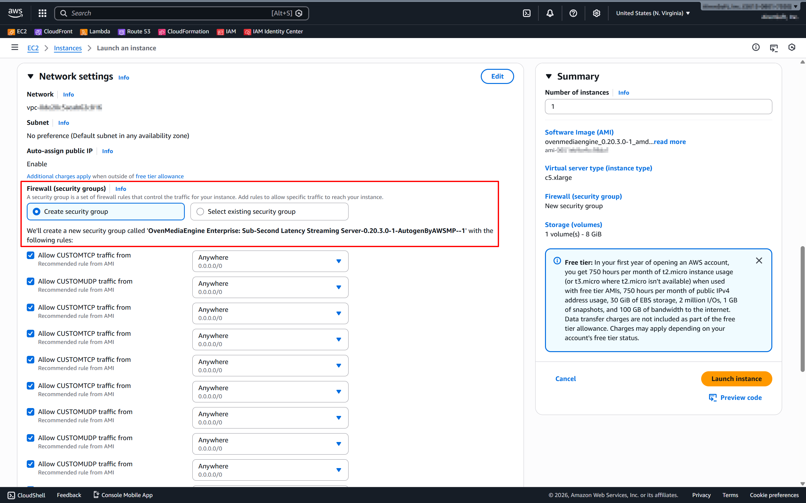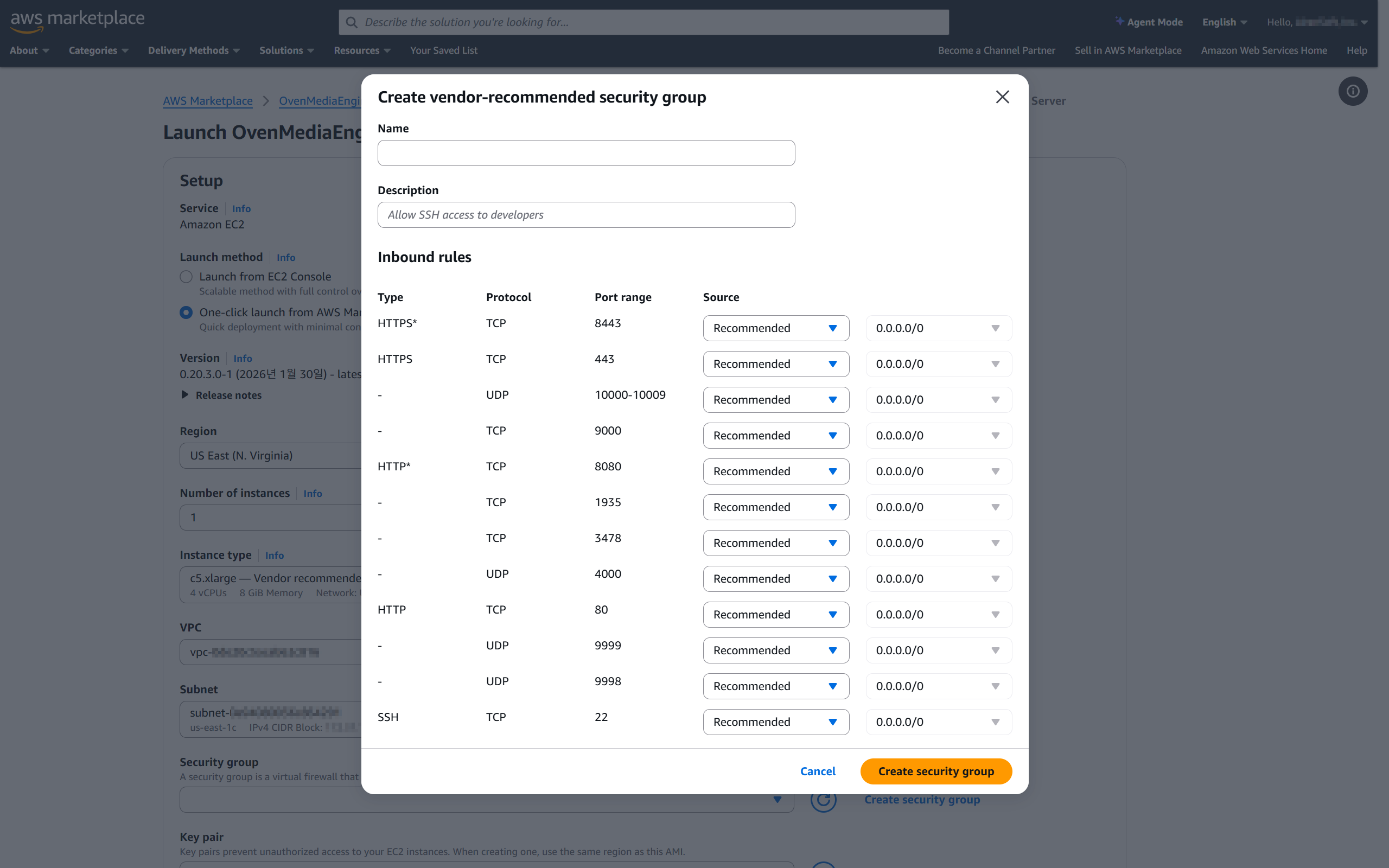 For details on the ports included in the <mark style="color:yellow;">\[Vendor-recommended security group]</mark>, please refer to the [Inbound Security Group Rules](https://ovenmediaengine-enterprise.gitbook.io/guide/exclusive/aws-marketplace/getting-started-on-aws/inbound-security-group-rules) guide.