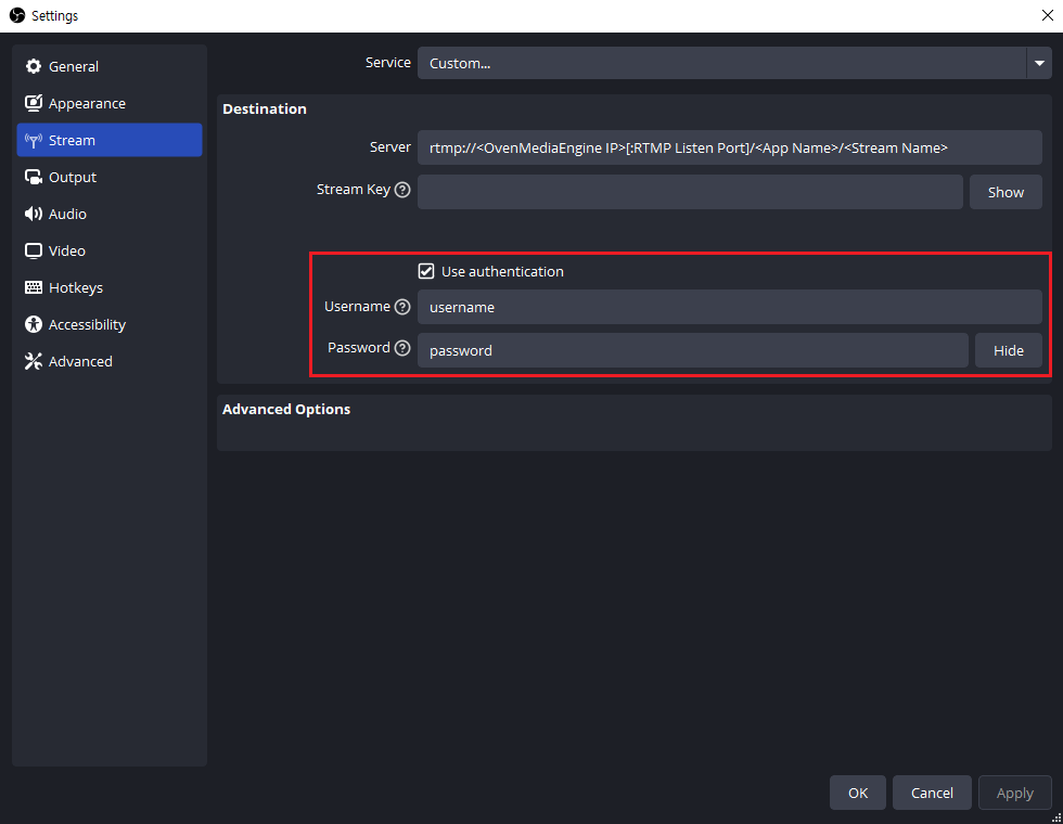## Using RTMP Authentication in OBS