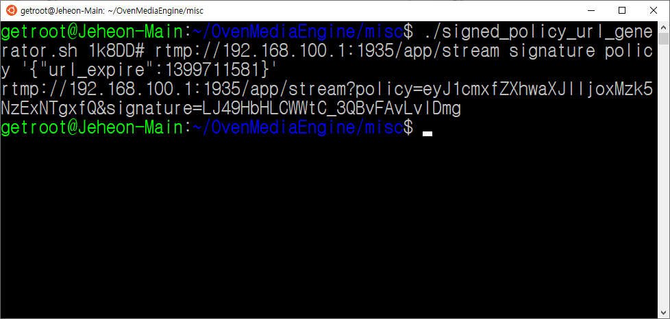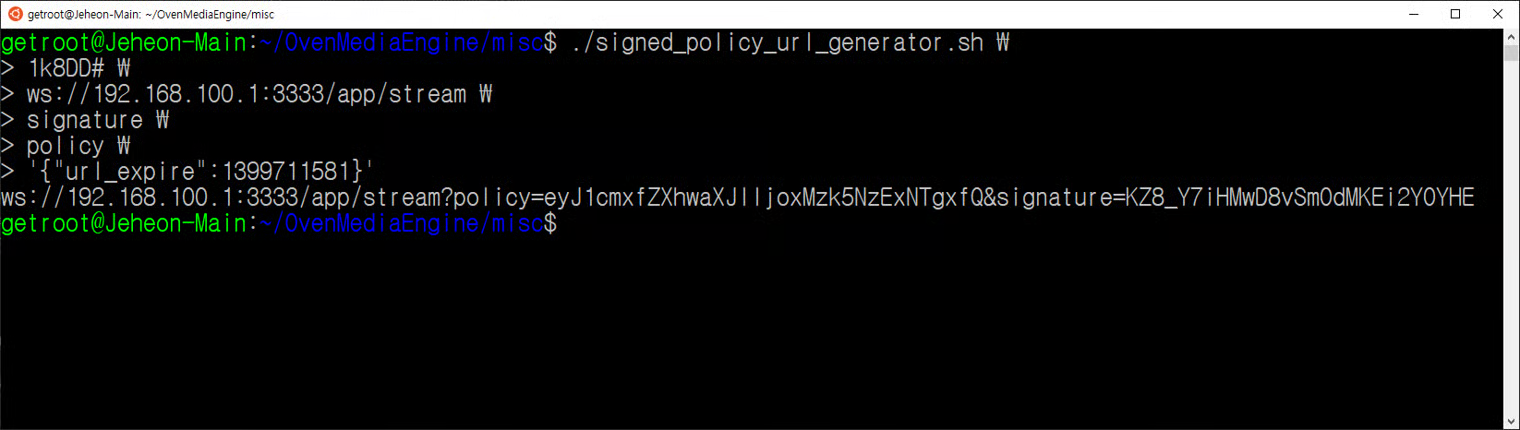 SignedPolicy URL consists of the query string of the streaming URL with Policy and Signature as shown below. If SignedPolicy is enabled in the configuration of OvenMediaEngine, access to URLs with no signature or invalid signature is not allowed. Signature uses HMAC-SHA1 to authenticate all URLs except signature.