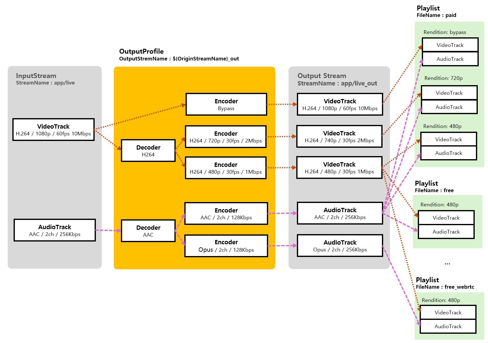 OvenMediaEngine supports Live Transcoding for Adaptive Bitrate(ABR) streaming and protocol compatibility.  Each protocol supports different codecs, and ABR needs to change resolution and bitrate in different ways.  Using **OutputProfile**, codecs, resolutions, and bitrates can be converted, and ABR can be configured as a variety of sets using a **Playlist**.