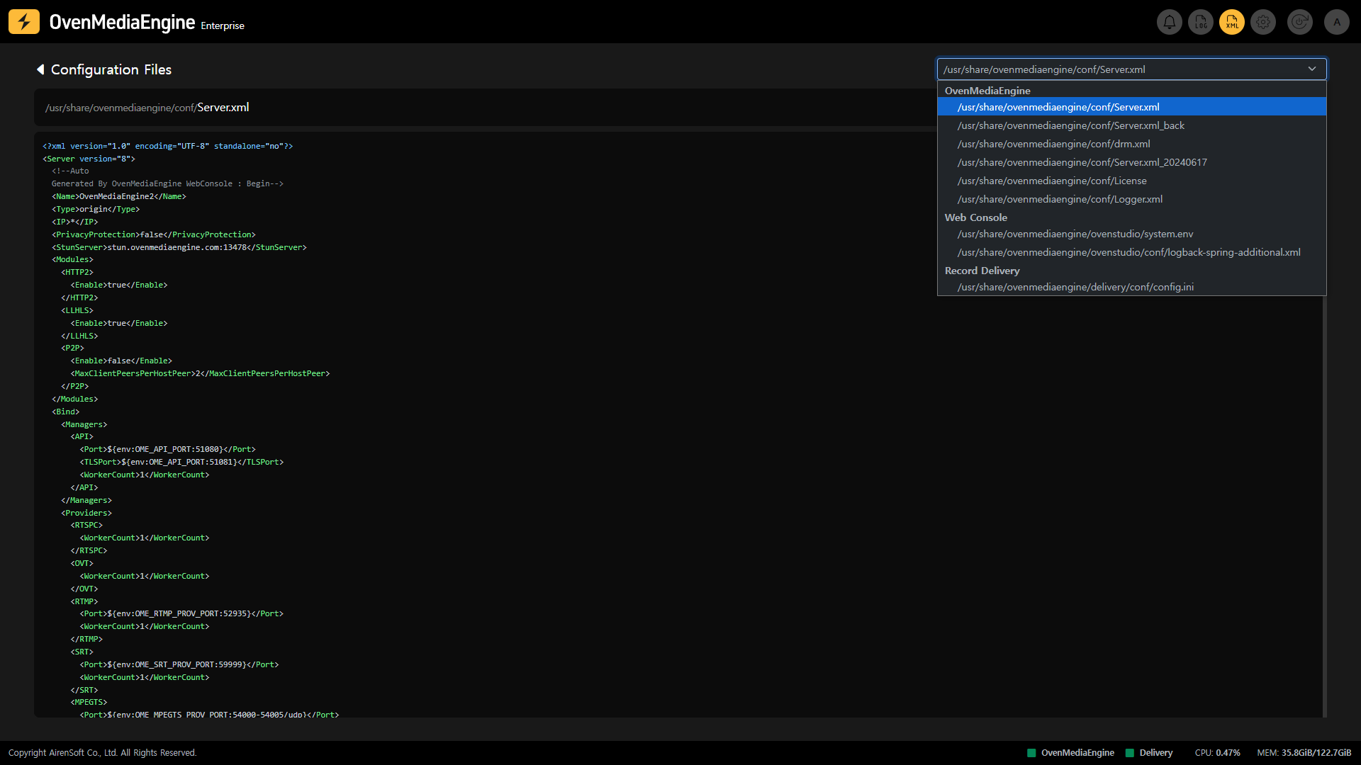You can also view all .XML files in the folder where OvenMediaEngine Enterprise is installed by clicking the drop-down menu in the upper right. If OvenMediaEngine is not working as intended, you can use this feature to view the Configuration Files and, if necessary, restart the system.