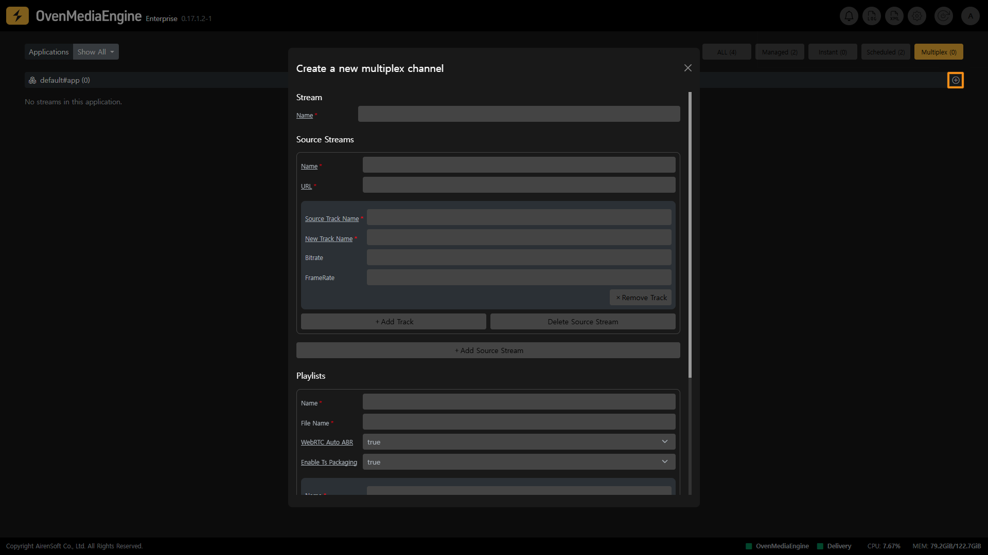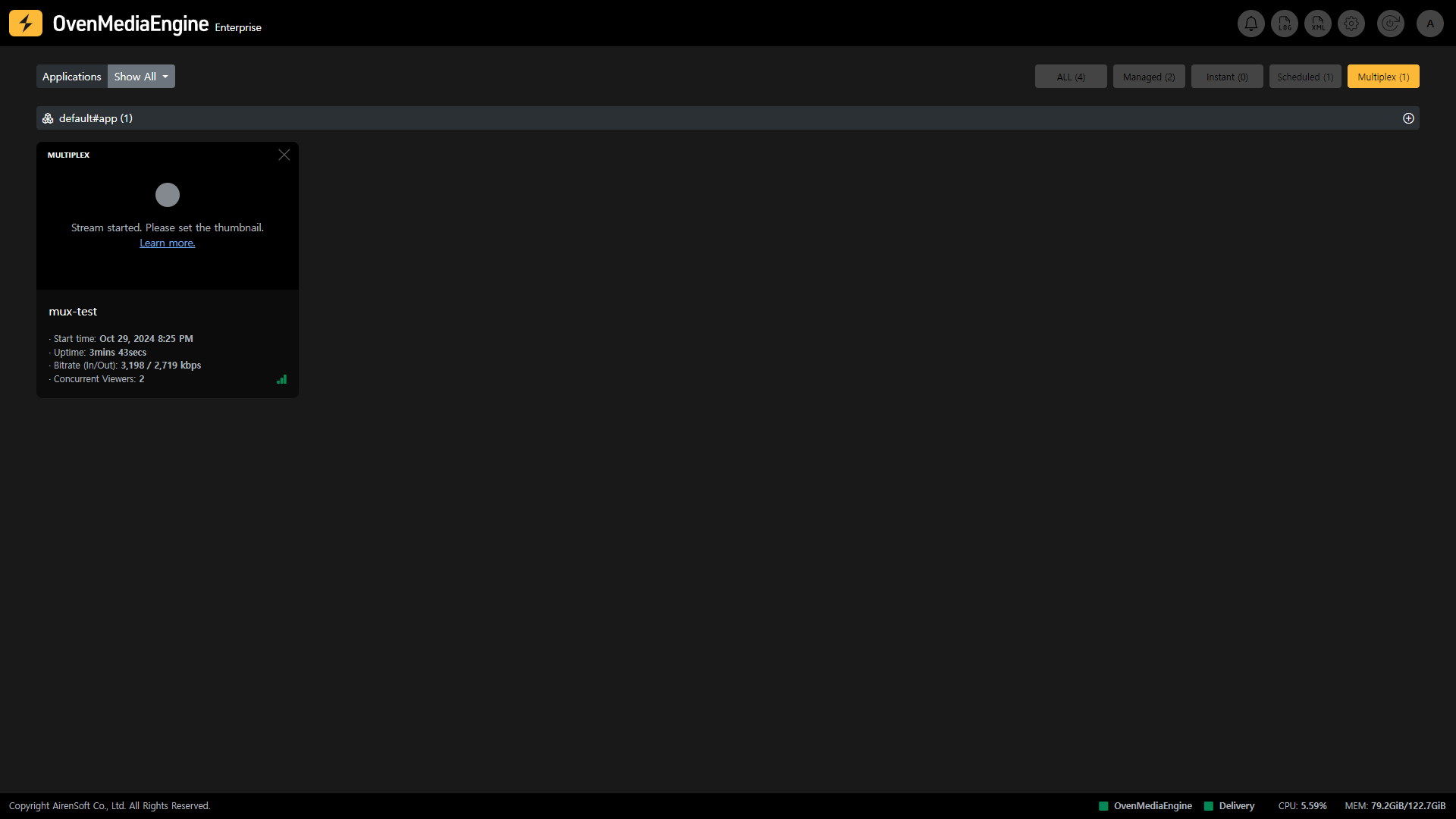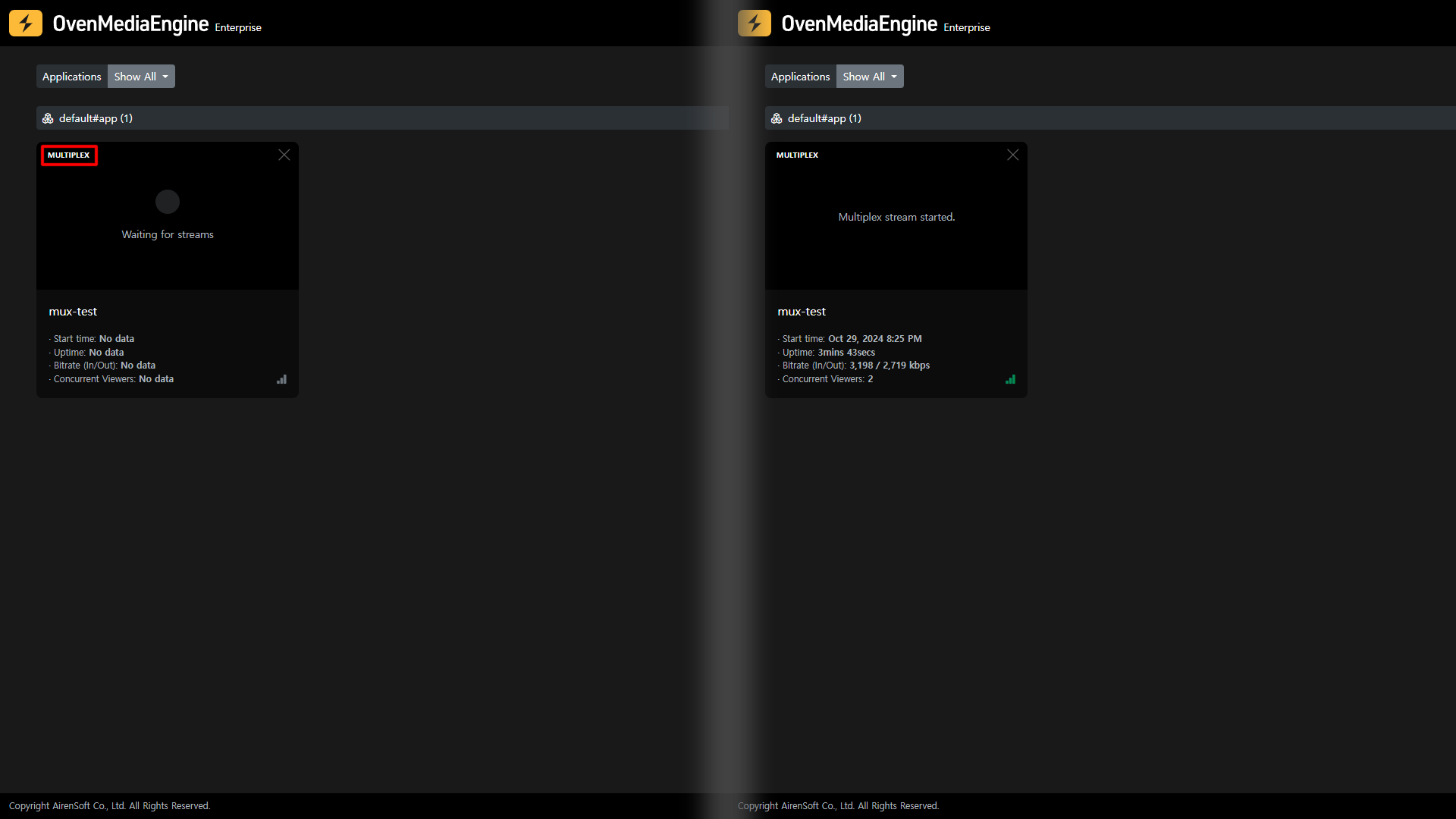 You can use the Multiplex Channel feature within OvenMeidaEngine Enterprise to combine multiple ingressing streams into one stream to form an Adaptive Bitrate Streaming (ABR) or to duplicate an external stream and send it to another Application. Multiplex Channel can also take already encoded tracks from other Local Streams and compose them into its tracks, which can be useful when changing codecs or re-tuning quality.