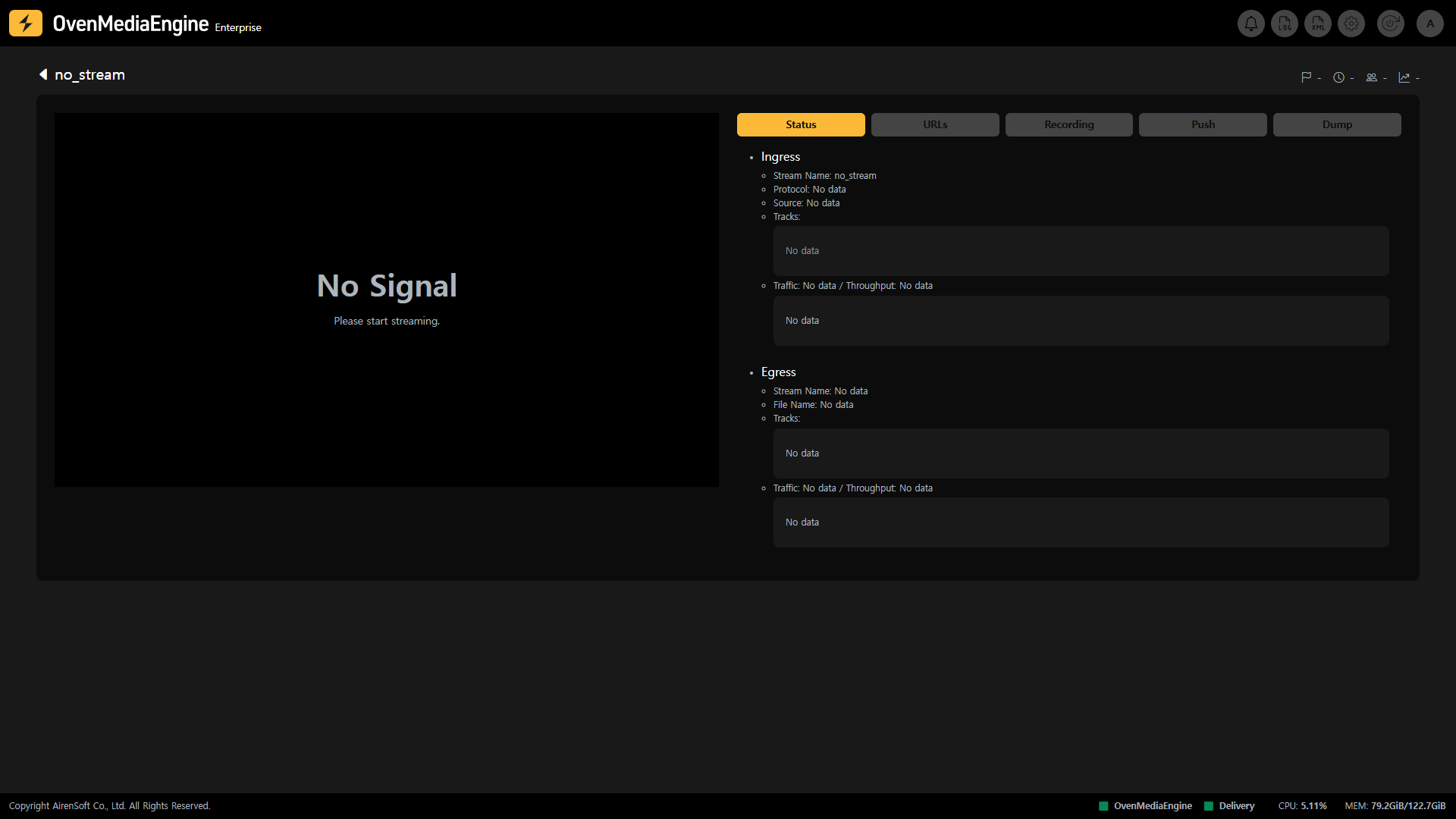Managed Streams, Scheduled Channels, and Multiplex Channels, when there is no ingress stream and it is waiting, it is displayed as No Signal and No data.
