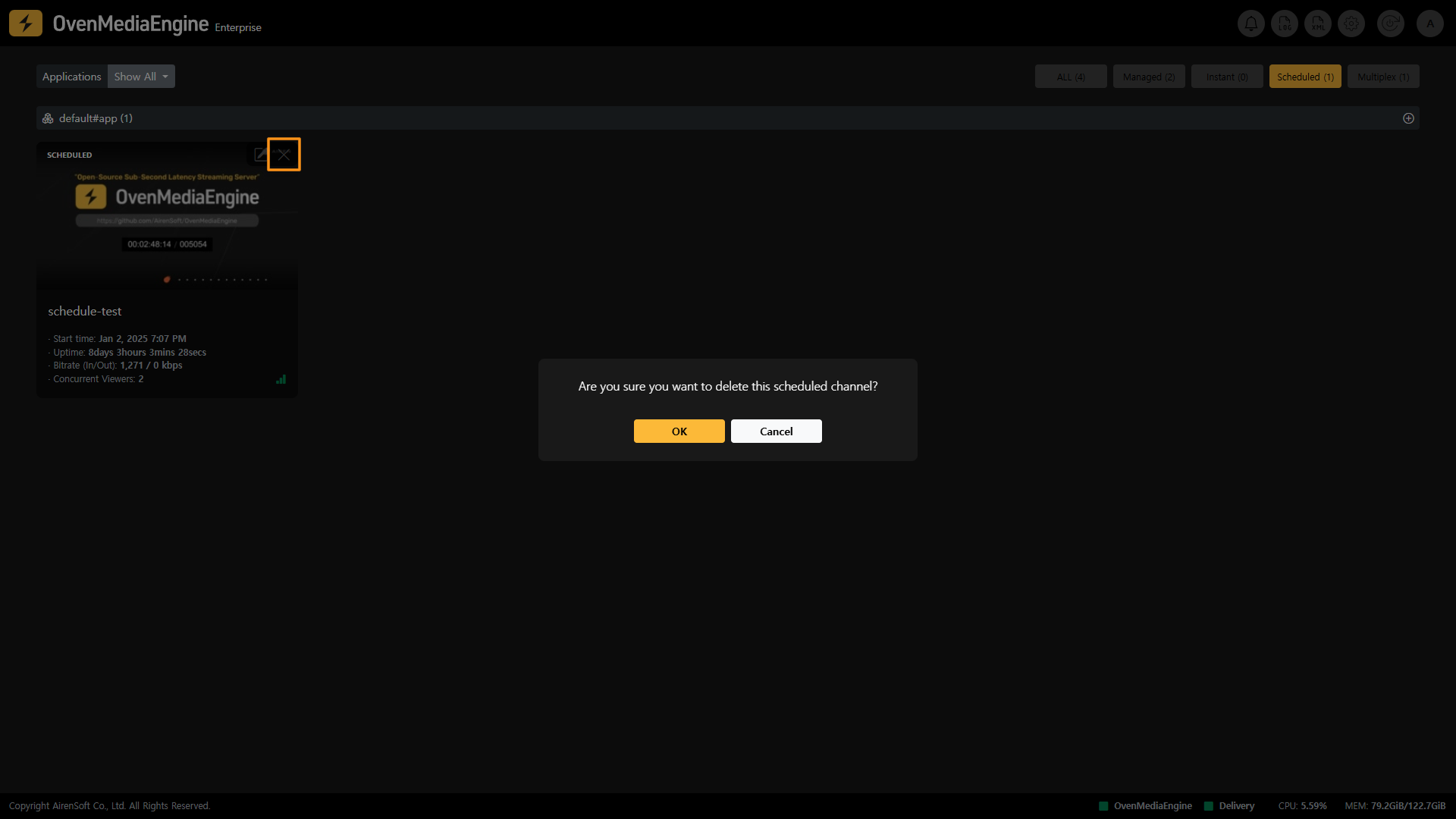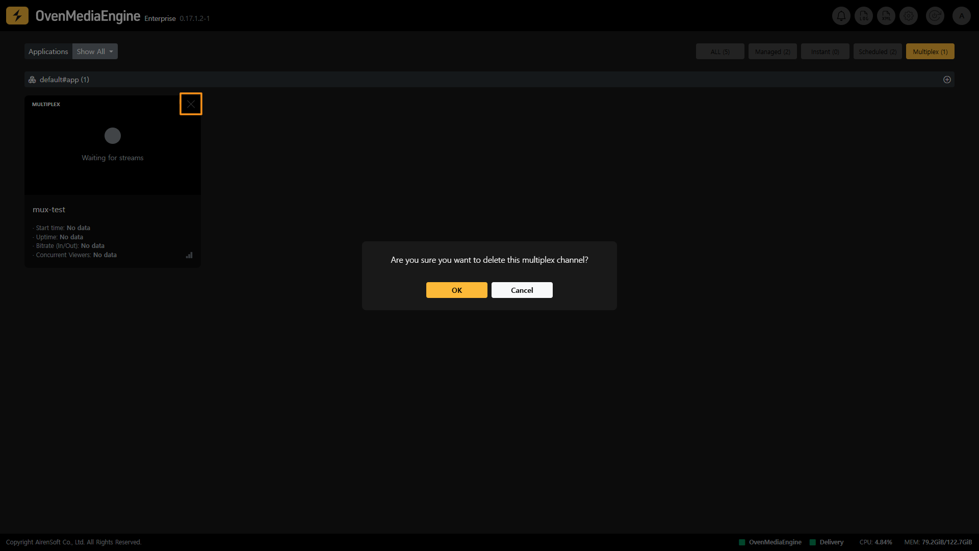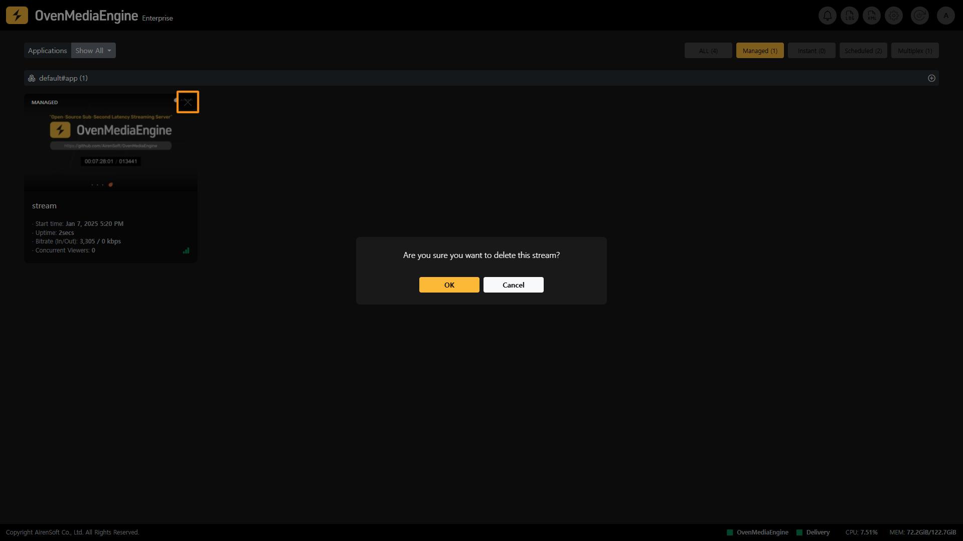 You cannot directly delete the Instant Stream from OvenMediaEngine Enterprise, and it will automatically disappear from the Instant Streams list when transmission from cameras, live encoders, etc. is stopped.