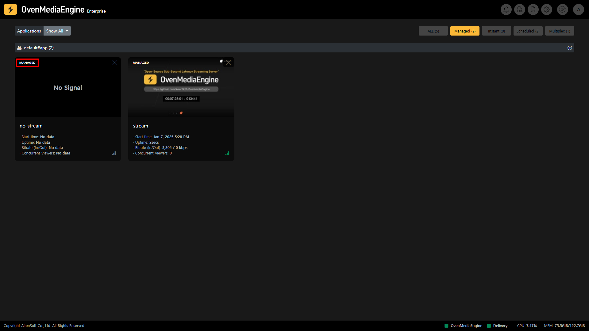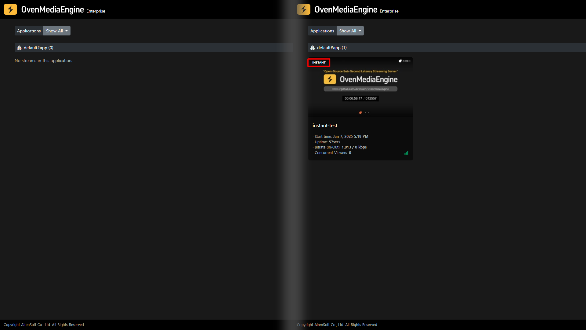 Instant Stream is a feature that detects streams sent to OvenMediaEngine Enterprise that are not designated as Managed Streams, automatically classifies them as Instant, and provides a list for monitoring.
