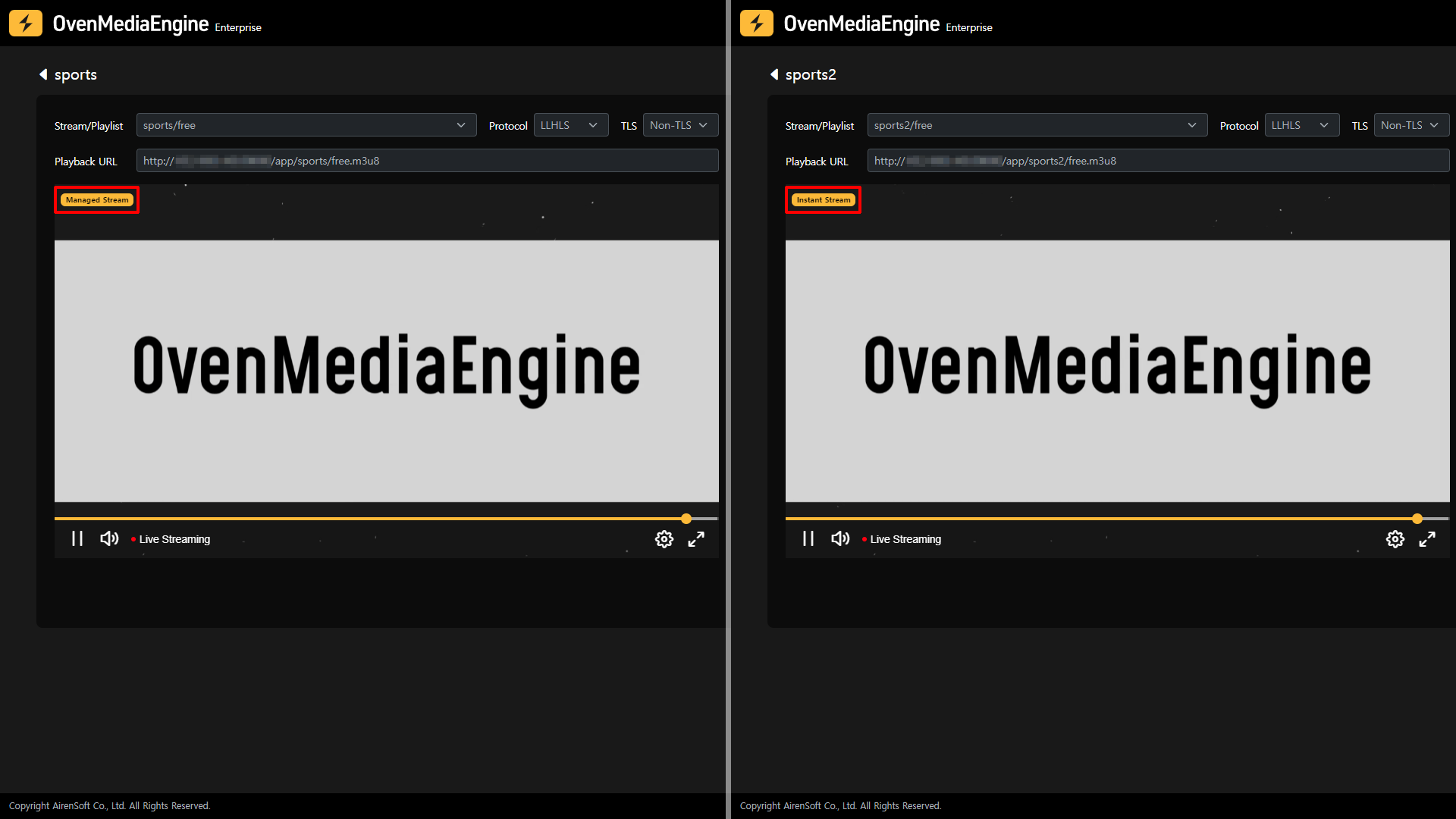 Managed and Instant Streams are categorized in the Stream List, so you can easily distinguish them. Also, if you select Managed or Instant Stream and go to the Stream Monitoring screen, you can easily check it by the icon marked on the upper left of the OvenPlayer where the corresponding Stream is playing.
