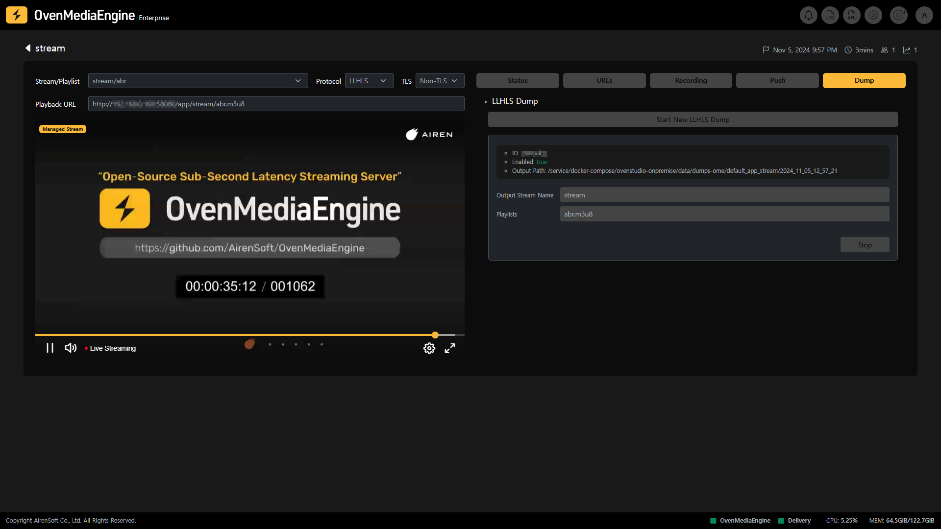 LLHLS Dump Settings Guide: https://airensoft.gitbook.io/ovenmediaengine/streaming/low-latency-hls#dump