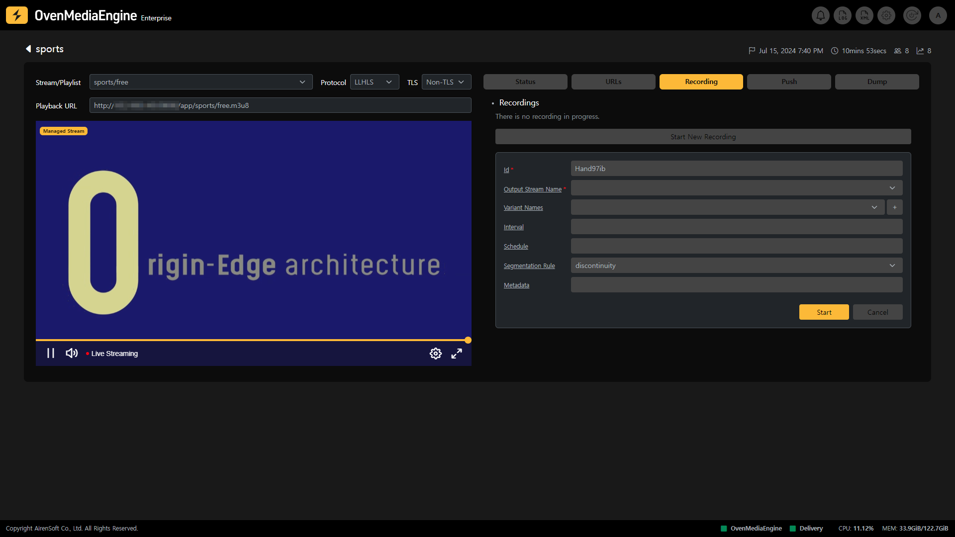 You can check the detailed (LL)-HLS Dump status through the Dump tab in Stream Monitoring and control the Dump using the Start/Stop (LL)-HLS Dump function.