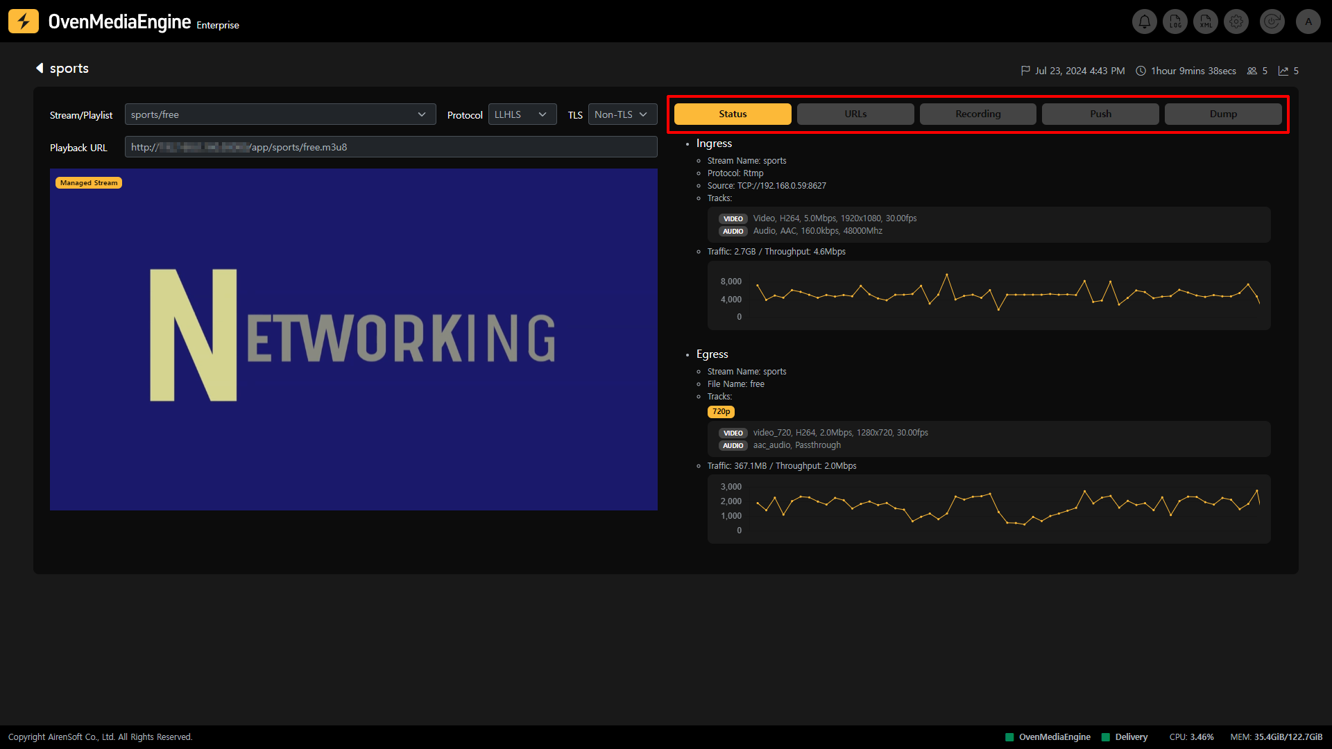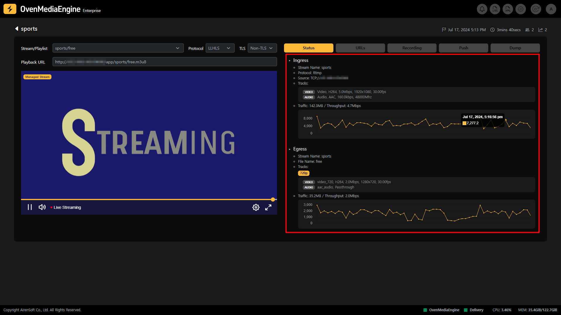 URLs: You can see the Ingress/Egress URLs of the stream, and the available Ingress/Egress Protocols are displayed according to the OvenMediaEngine settings.