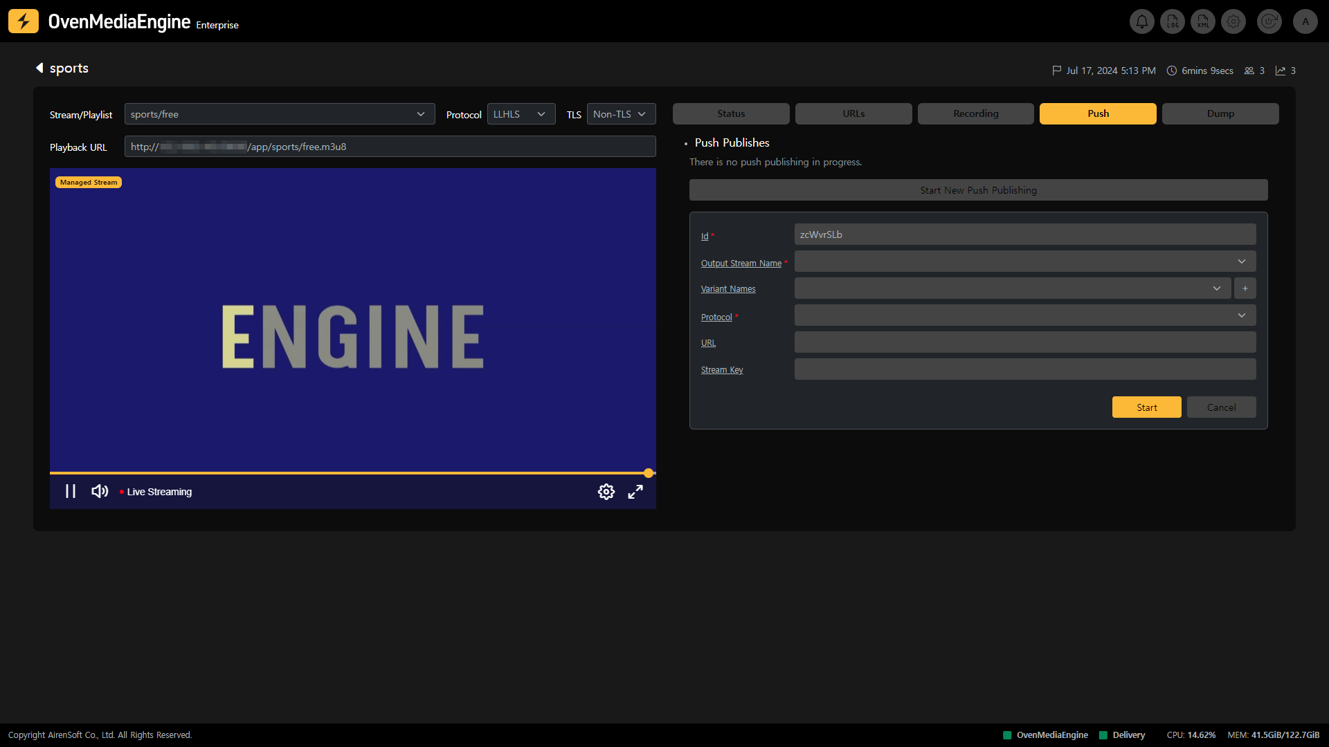 Push Publishing is a function that retransmits a stream ingested into OvenMediaEngine Enterprise to other platforms. While the stream is being Push Published, you can see the Push Publishing mark in the Stream List to know at a glance that it is being restreamed.