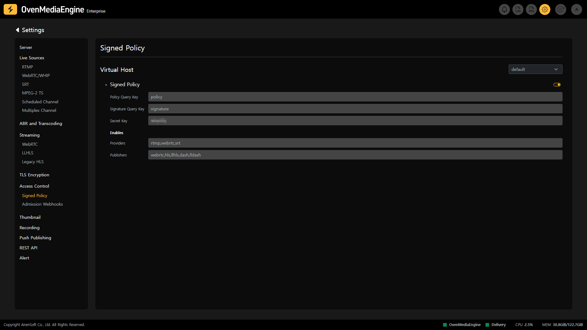 Policy Query Key: The query string key name in the URL pointing to thePolicyvalue.Signature Query Key: The query string key name in the URL pointing to theSignaturevalue.Secret Key: The secret key used when encoding with HMAC-SHA1.Enables: List of Providers and Publishers to enableSignedPolicy.