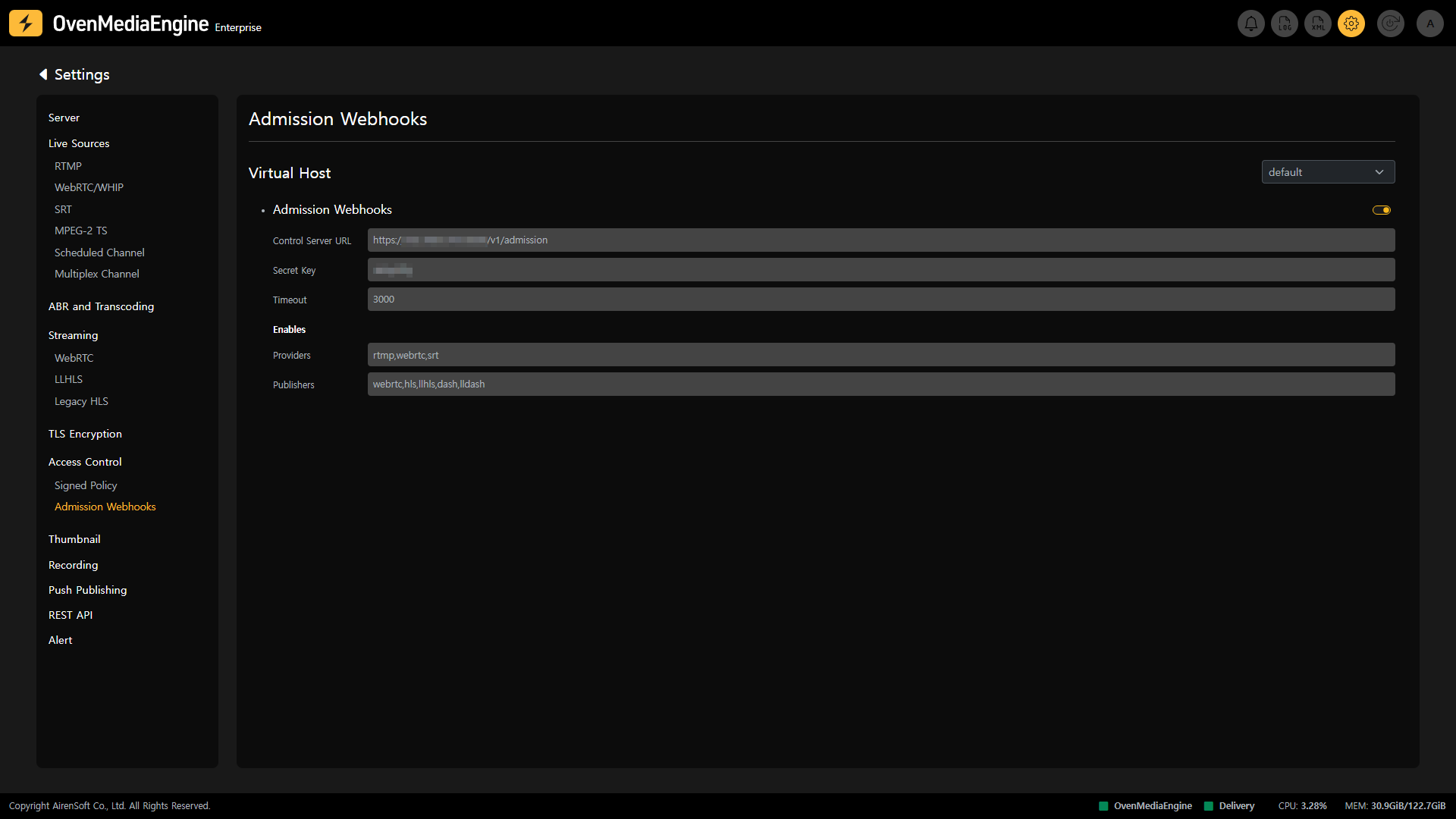 On the Access Control Settings, you can check if access restrictions for Ingress and Egress streams provided by OvenMediaEngine are enabled and what the settings are.