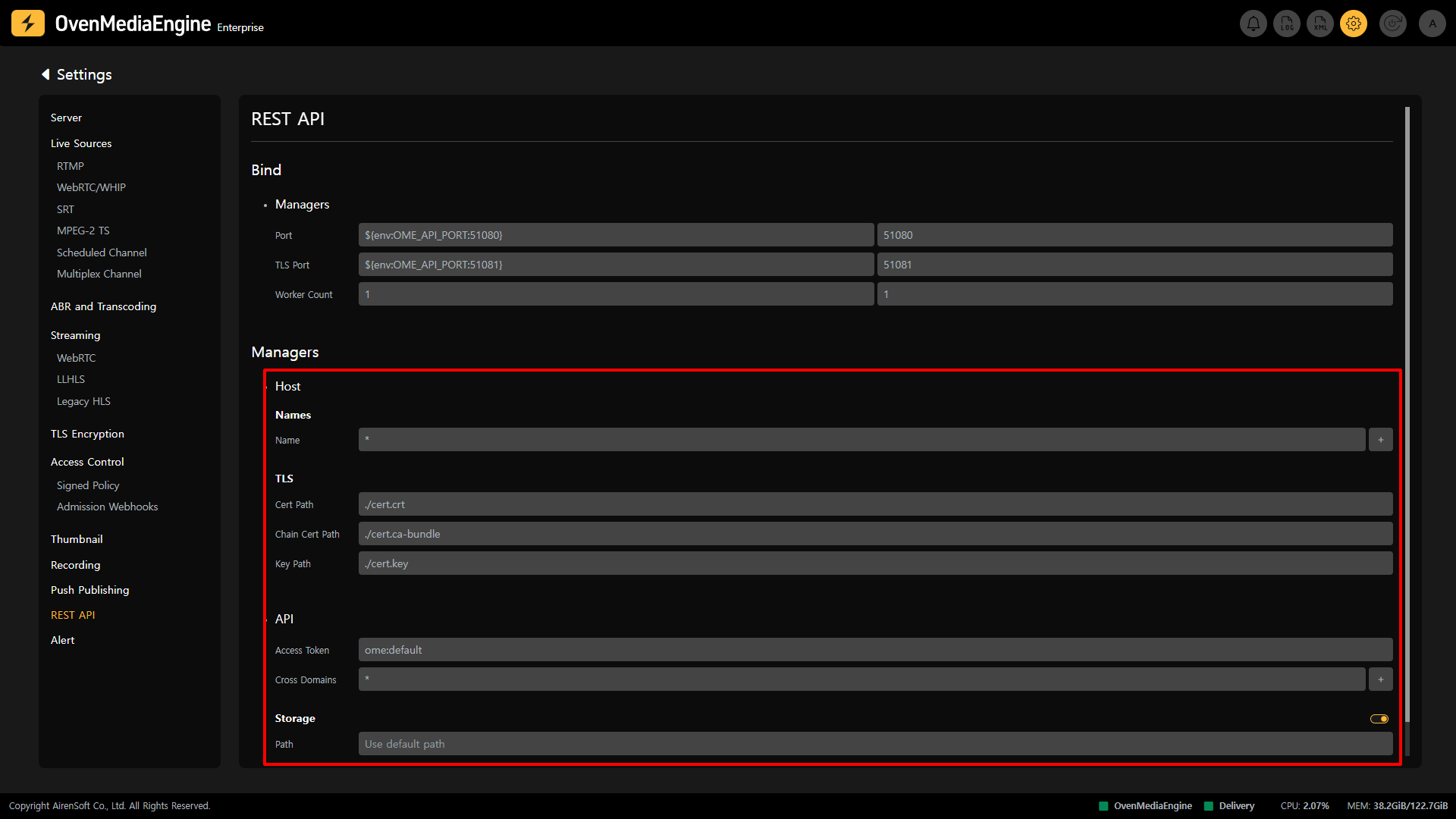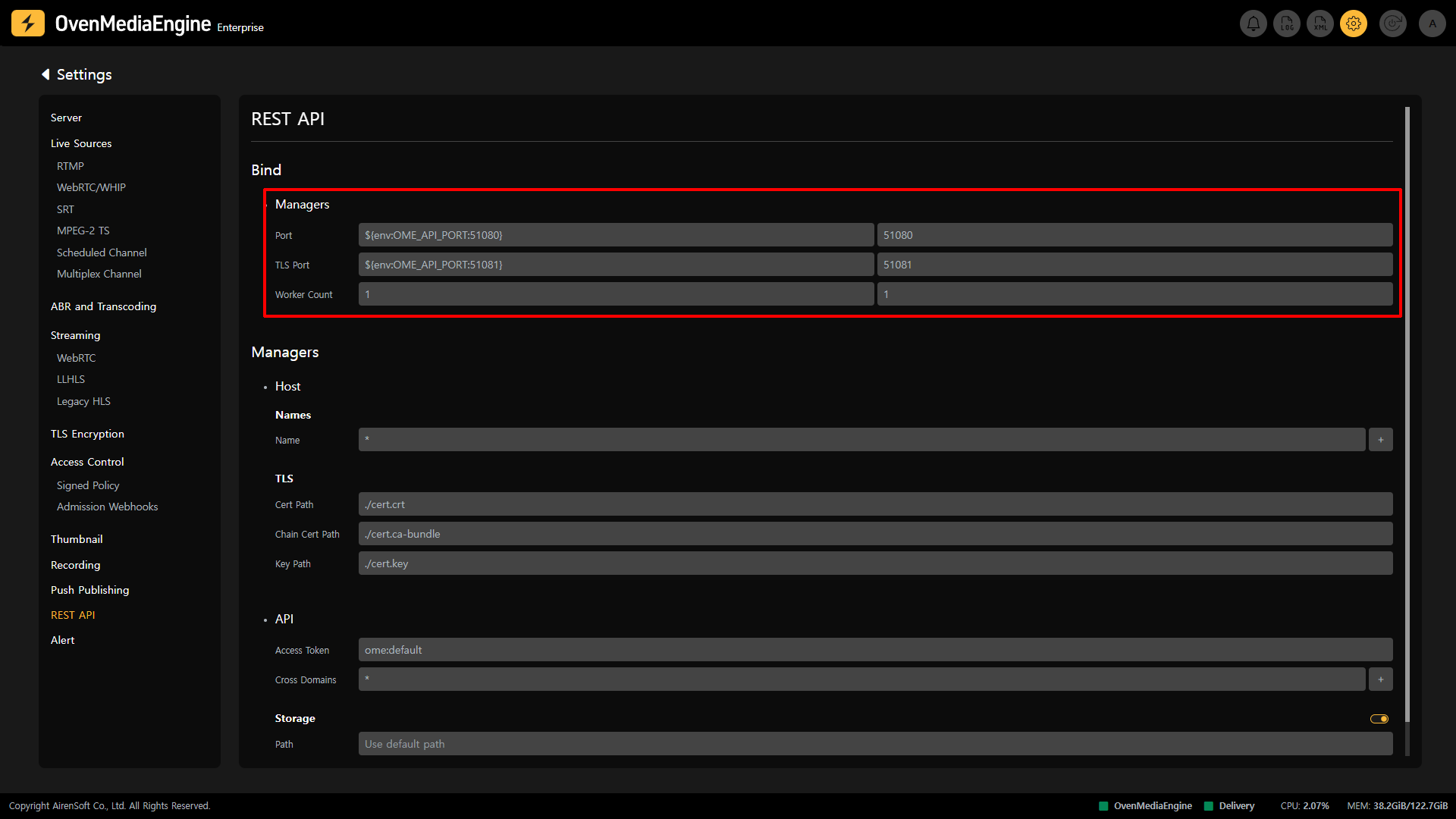 OvenMediaEngine Enterprise supports REST API Server from version 0.11.0.0-1. However, the APIs provided for each function may differ depending on the OvenMediaEngine Enterprise's version.