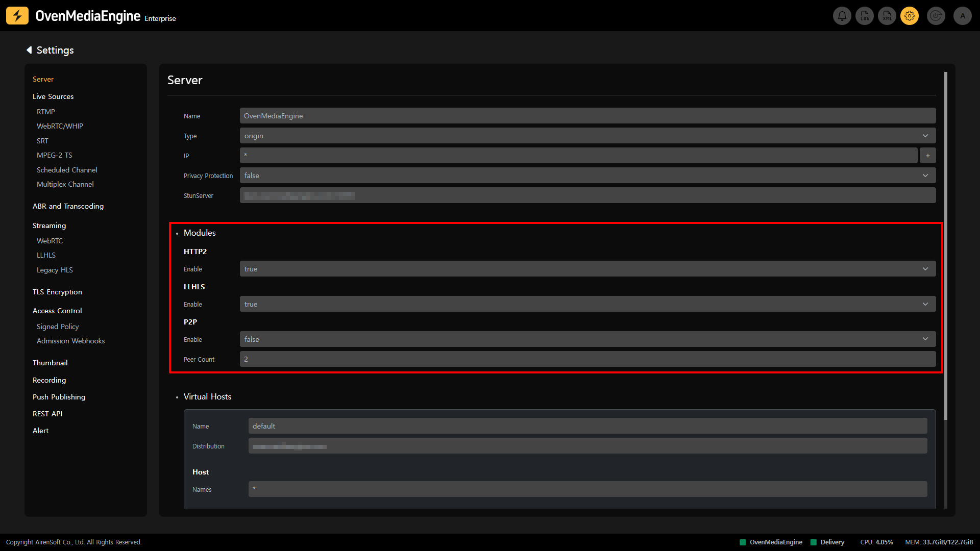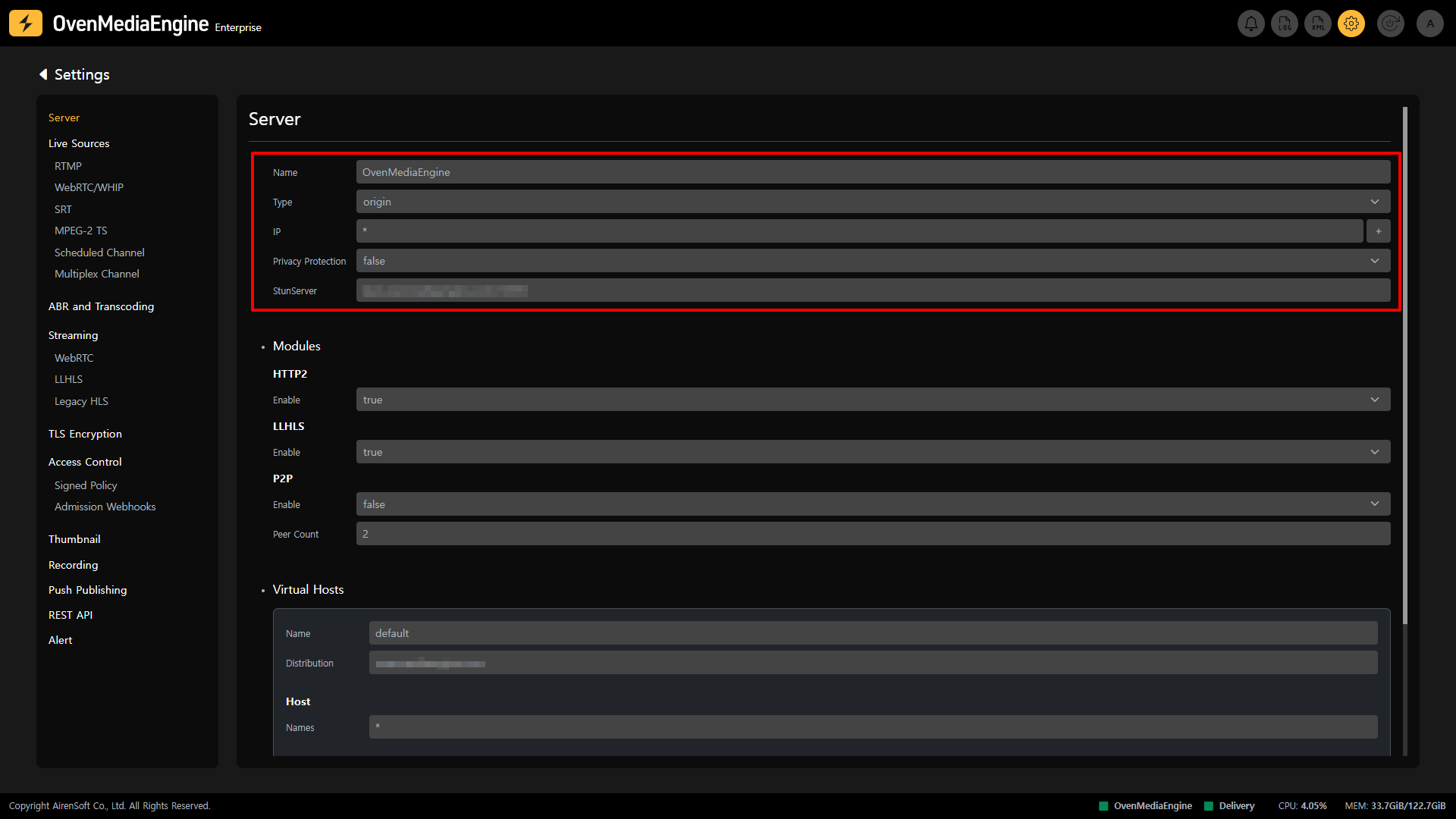 In the Server section of the Settings, you can check the Server Settings Information of OvenMediaEngine Enterprise referenced by OvenMediaEngine, Each Module Settings Information, Virtual Host Settings Information, etc., and you can modify the current Server Name, Server Type, Server IP, Privacy Protection, Stun Server, and more. The modified items will be reflected in Server.xml.