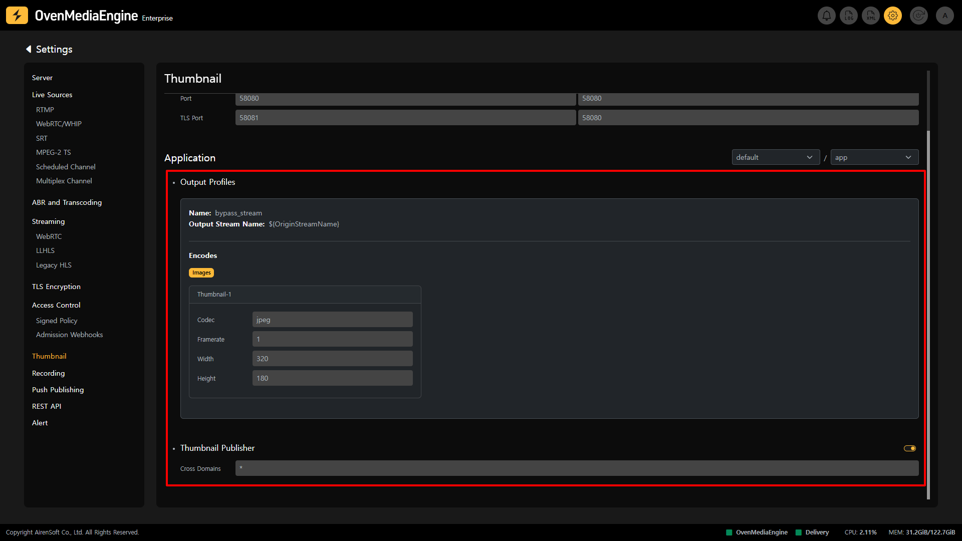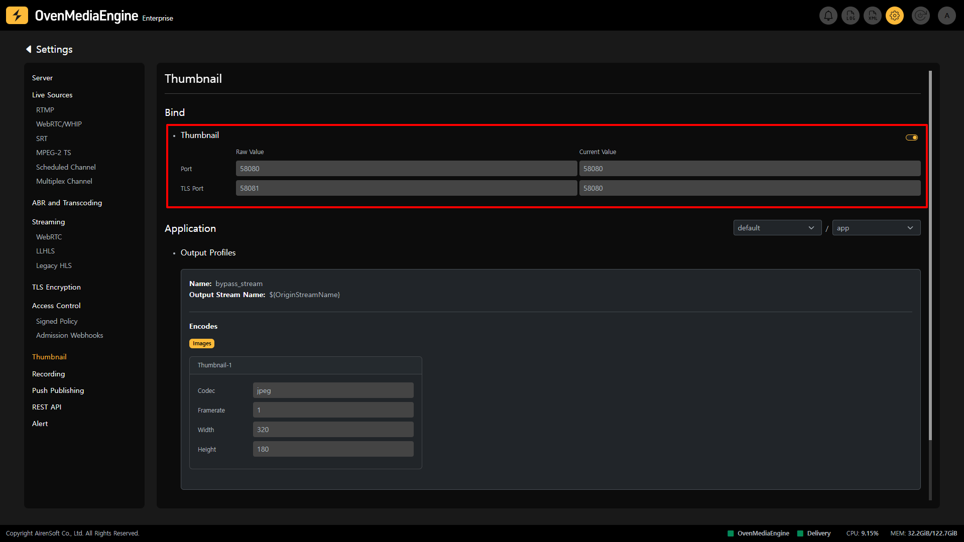 OvenMediaEngine Enterprise provides basic thumbnail functionality starting from version 0.11.0.0-1, and more extensive thumbnail support starting from version 0.15.7.0-1.